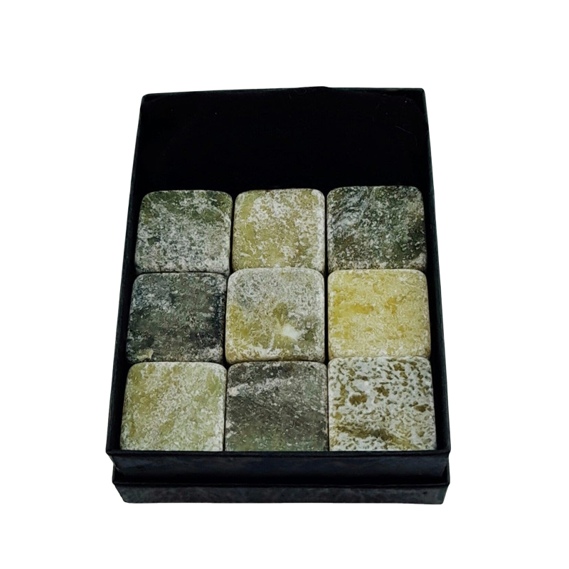 A Set of 9 Connemara Marble Whiskey Stones in a carry bag. Beautifully finished in a presentation box with information leaflet.
