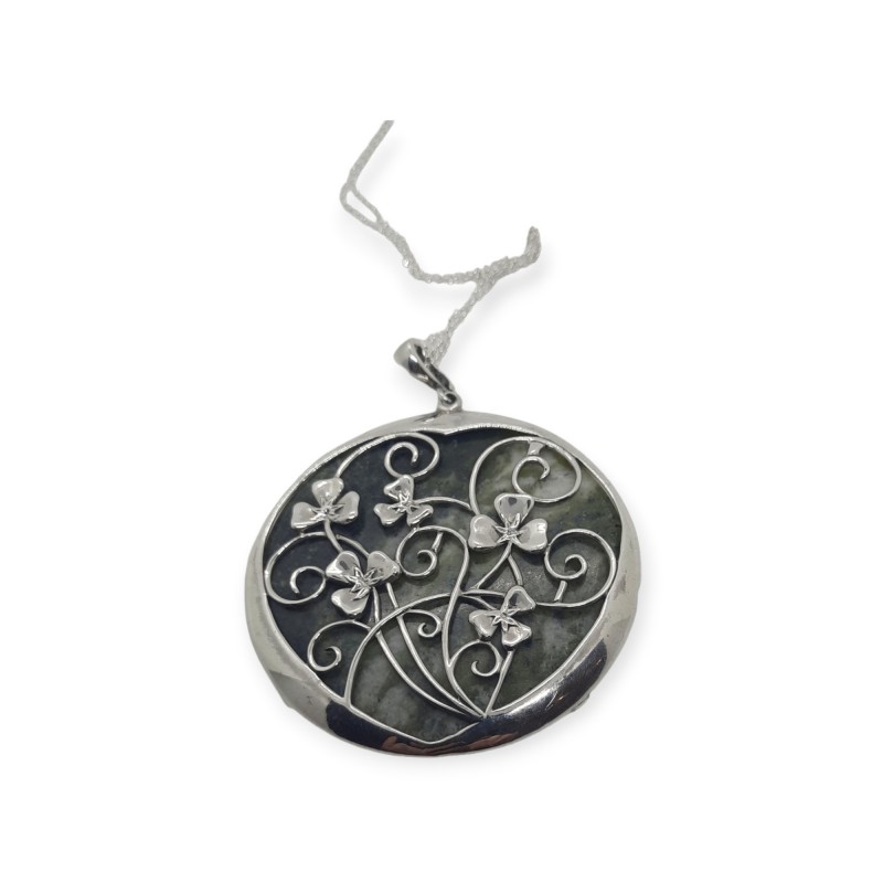 Connemara Marble Shamrock Pendant made from Sterling Silver and a large disc of Connemara Marble.